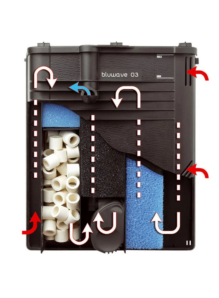 - il filtro Bluwave 03 è stato potenziato con la pompa Blupower 350 l/h in modo da garantire un’acqua sempre limpida e cristallina.