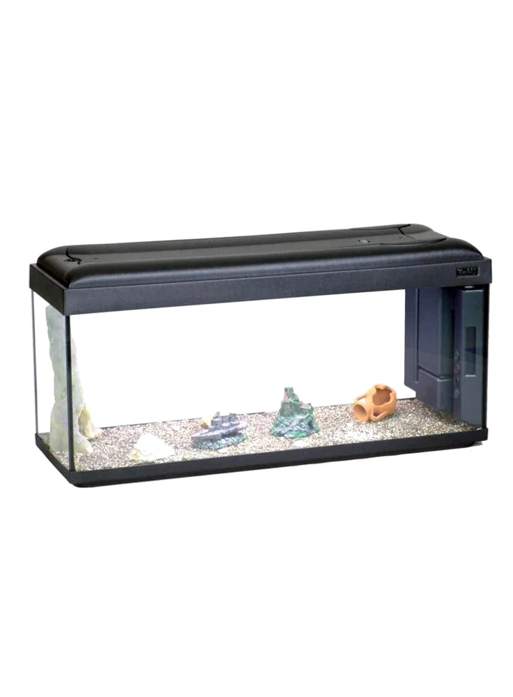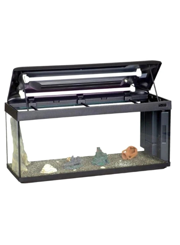 Acquario in vetro completo di coperchio plastico, sistema di illuminazione con portalampade a tenuta stagna, filtro biologico, pompa di ricircolo e termoriscaldatore.