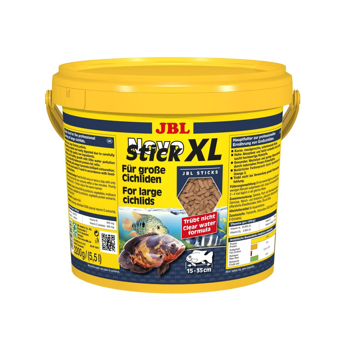 JBL NovoStick XL contiene una miscela bilanciata di componenti adattati alle specifiche esigenze dietetiche di grandi ciclidi carnivori e altri grandi pesci d’acquario. È composto da pesce e prodotti ittici, cereali, alghe, lieviti e altri derivati ??di origine animale. Le vitamine di vitale importanza e gli estratti naturali assicurano una crescita sana, colori brillanti e migliorano la resistenza dei pesci. Grazie alla sua presentazione granulare all’ingrosso, NovoStick XL è apprezzato dai pesci e sazia rapidamente i grandi ciclidi e altri pesci di grandi dimensioni provenienti dall’acquario. Questo cibo può essere somministrato più volte al giorno, ma in piccole quantità che vengono consumate in pochi minuti. Cibo completo colorato con additivi CEE. Antiossidante: E 306