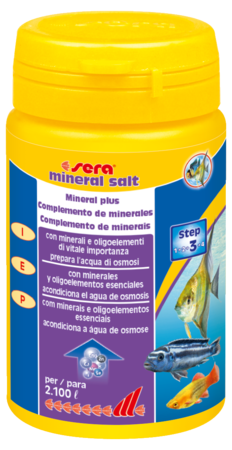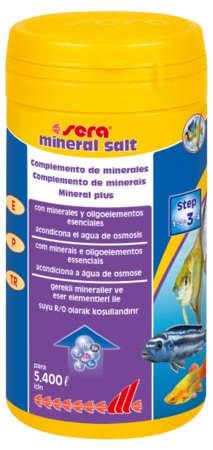 distribuire settimanalmente 5 g (un cucchiaino raso) di sera mineral salt per ogni 100 l di acqua. In caso di un alto fabbisogno di minerali il dosaggio può essere aumentato secondo necessità. Un semplice dosaggio aumenta il GH mediamente di 1,3 °dGH. Il KH rimane inalterato.
