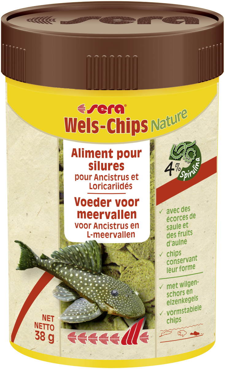 Sera Wels Chips Nature Chips ricchi di fibre per Ancistrus e Loricaridae è l’alimento composto senza coloranti o conservanti per i pesci di terra che raschiano o succhiano il loro cibo, come Ancistrus e Loricaridae.