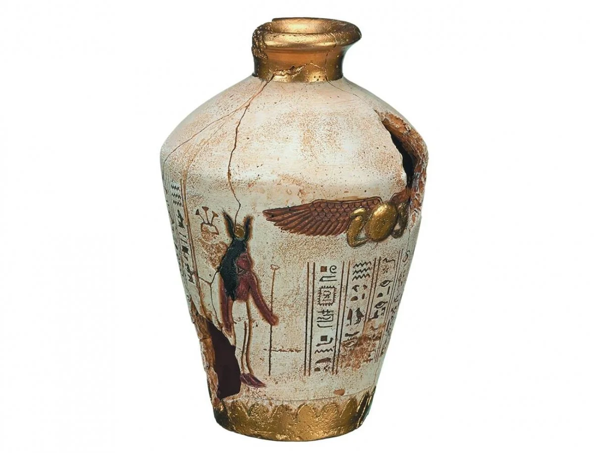 Questo vaso egiziano presenta geroglifici e rappresentazioni degli dei dell’epoca. Dipinto a mano, porta bellissimi colori dorati che testimoniano il fasto di quel tempo.